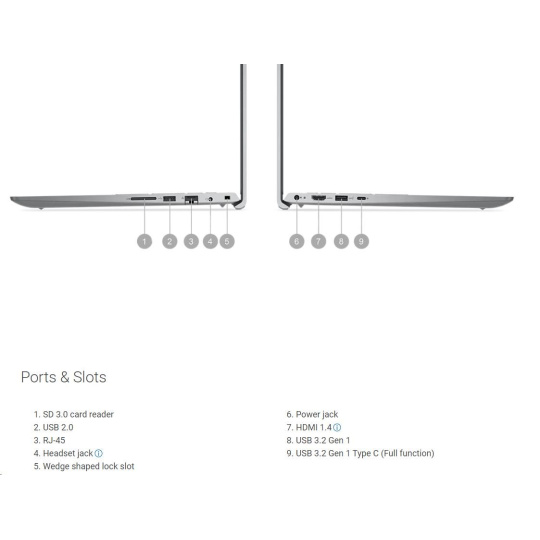 1. SD 3.0 card reader 6. Power jack Upozornenie: U tohto modelu podporuje USB-C iba prenos dát. Nepodporuje dokovanie, obrazový výstup (DisplayPort), ani funkciu PD (Power Delivery).  |
