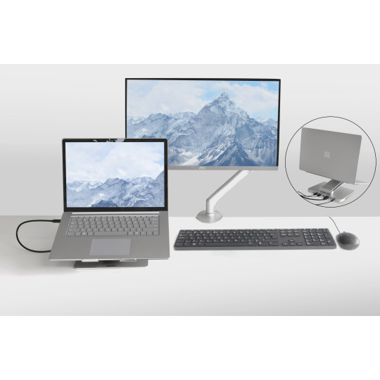 Proměňte svůj notebook v výkonnou desktopovou pracovní stanici s DESQ Notebook Dockem. Stačí připojit USB-C kabel a získáte přístup k externím monitorům, klávesnicím, myším a dalším periferiím. Stojan je kompatibilní s MacBooky, notebooky s USB Type-C, tablety a mobilními telefony. ? Promění váš notebook v desktop PC s plynulou integrací přes USB-C ? Plně nastavitelný pro ergonomickou výšku a úhly ? Zvedá obrazovku až o 28 cm pro lepší komfort při sledování ? Platforma nastavitelná až do úhlu 70 ° pro dokonalou polohu obrazovky ? Lehká konstrukce a skládací design pro snadné přenášení ? Výřezy v konstrukci podporují proudění vzduchu a udržují notebook v chladu ? Pevná a odolná hliníková slitina pro dlouhou životnost ? Silikonové podložky a nožky pro stabilitu a ochranu proti skluzu S DESQ stojanem na notebook nastavíte obrazovku do ideální výšky, což podporuje zdravé a ergonomické držení těla a pomáhá předcházet bolesti zad, krku a únavě očí..