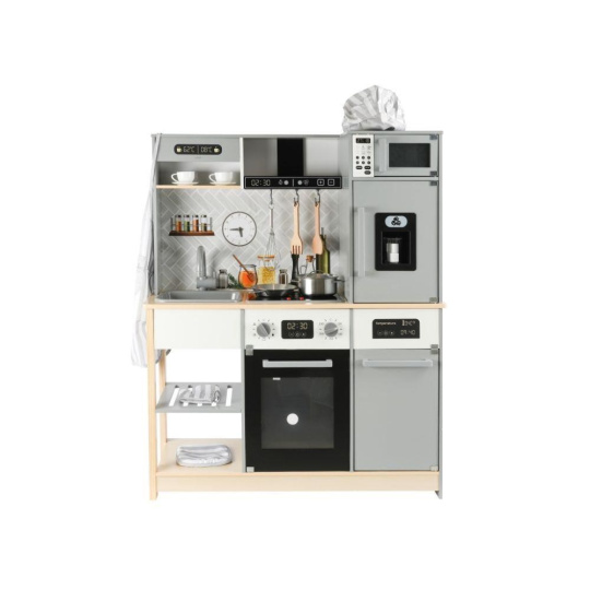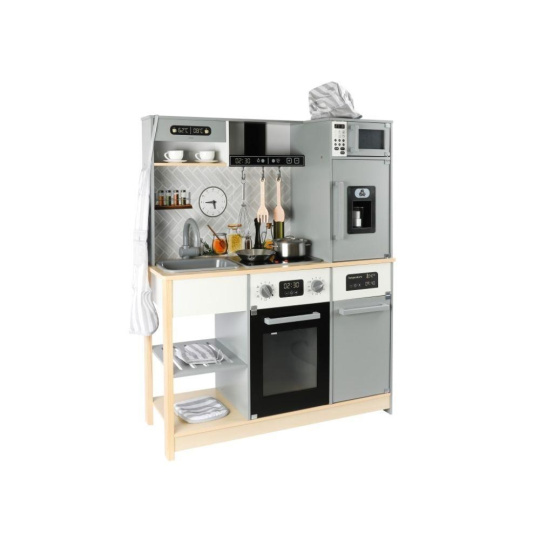 Dětská kuchyňka vybavená moderními spotřebiči, doplněná o bohaté příslušenství a textilní kuchařský set ZDARMA, okouzlí holčičky i chlapce. Dřevěná kuchyňka ve skandinávskému stylu je vhodná do každé místnosti. Díky této krásné edukativní hračce si děti vyzkouší vaření, pečení, chystání pokrmů, umývání nádobí a další činnosti bezpečným dětským způsobem. Při hře v moderní kuchyňce děti zdokonalí své dovednosti a ještě si užijí spoustu zábavy..