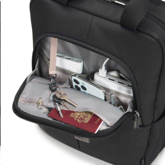 Spacious front pocket with zipped pocket, key holder and workstation for accessories, plus power supply and cables