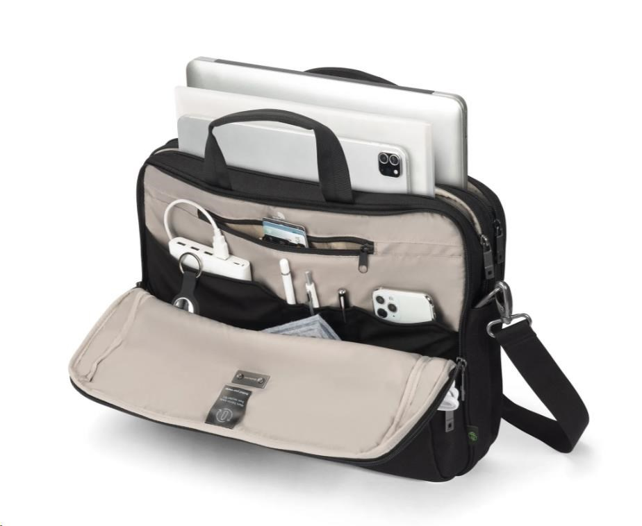 Brašna Top Traveller FIVE je navržena tak, aby chránila vaše zařízení a zároveň vám umožňovala snadný přístup k nezbytnostem. Uzamykatelná přihrádka na notebook s ochranou DCT Notebook Protection a polstrováním rohů z HDF pěny a EVA zajišťuje maximální bezpečnost, zatímco integrovaná kapsa poskytuje bezpečné uložení tabletů do velikosti 12,9". Hlavní přihrádka nabízí dostatek prostoru pro dokumenty, složky nebo mobilní vybavení a přední část obsahuje uspořádané kapsy na příslušenství. Malá přední kapsa poskytuje další úložný prostor pro kabely a menší předměty. Vyrobeno z 23,5" recyklovaných PET lahví.