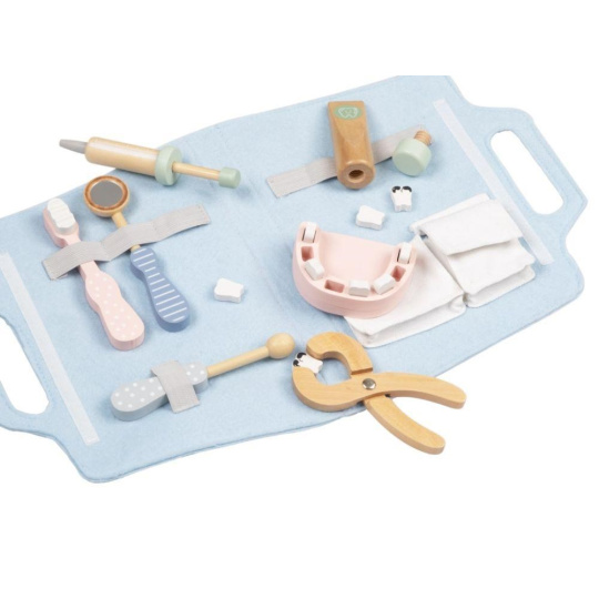 Doktorský kufřík (brašna) pro děti s vybavením pro malé zubaře je originální hračkou, se kterou se děti seznámí nejen se svými zoubky, ale i co obnáší profese zubaře. V roli zubaře nebo zubařky si děti vyzkouší vrtání zkažených zubů i jejich trhání. Na této hračce můžete svým dětem předvést, jak se správně čistí zoubky a jak to dopadá, když se ústní hygiena zanedbá. Pro snadný úklid i přenášení je sada uložena v praktické modré brašně..