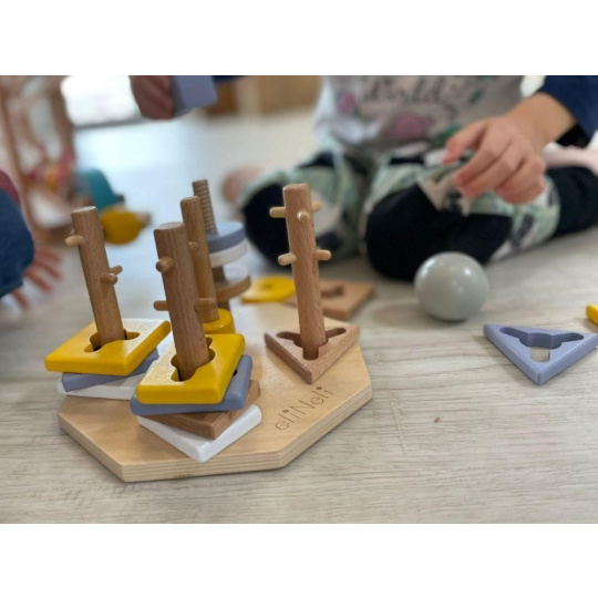 Úžasná motorická hračka, dřevěná navlékací hra s geometrickými tvary, přirozeným způsobem rozvíjí u děti motorické dovednosti, koordinaci očí a rukou, představivost, učí dětí soustředit se. Navlékací tvary v krásných neutrálních barvách děti nasazují na dřevěné kolíky, které však nejsou zcela hladké a dětem navlékání ztěžují různými výstupky. Někdy tato hra vyžaduje spoustu trpělivosti..