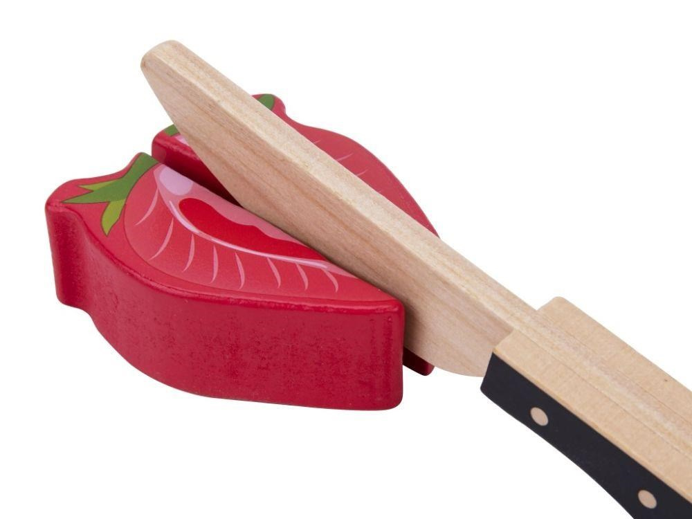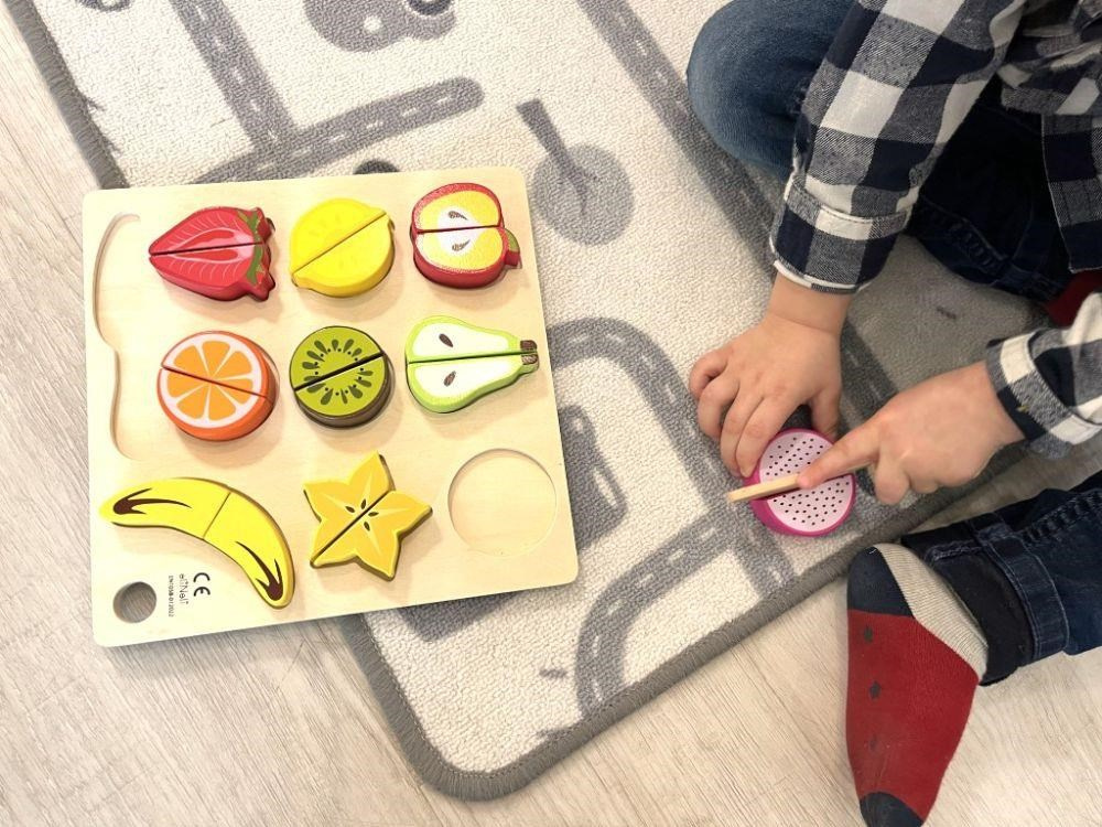 Dřevěné ovoce ke krájení je hračkou, která by neměla chybět v žádné dětské kuchyňce ani dětském obchůdku. Toto krájení je pro děti zcela bezpečné. Půlky ovoce jsou spolu spojený suchým zipem, díky kterému děti ovoce dřevěným nožem jednoduše rozkrojí. Balení obsahuje 9 druhů ovoce, dřevěné prkénko i dřevěný nůž..