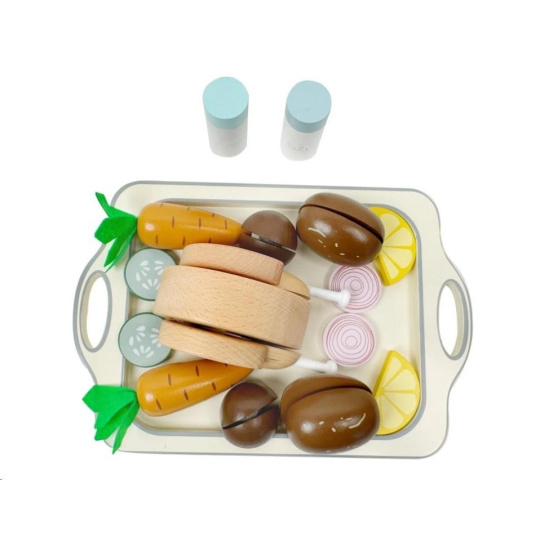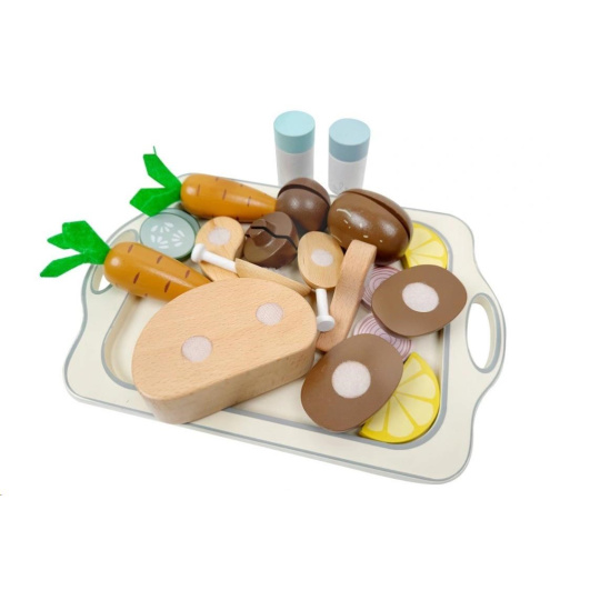 Dřevěné potraviny, zelenina, kuře, solnička s pepřenkou a velký tác usnadní dětem vaření a pečení v dětské kuchyňce. S touto dřevěnou sadou krájecích potravin bude pečení kuřete zábavnou hrou. Stačí ke kuřeti přidat oblíbenou zeleninu a potraviny, osolit, opepřit a vložit kuře do trouby. Upečené dřevěné kuře s oblohou na dřevěném tácu vypadá opravdu lahodně a je k nakousnutí.