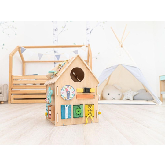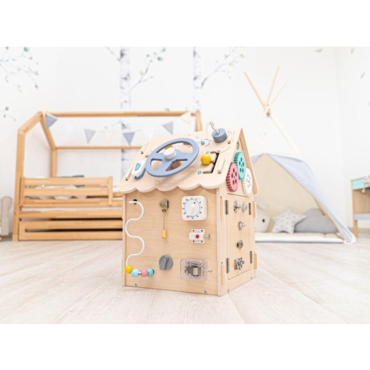 Domeček activity board v přírodním (natur) provedení, s montessori a hracími prvky, s volantem a dalšími zajímavými doplňky láká děti k prozkoumání, ke hře a k učení se. Dřevěný activity board domeček je hračkou i výukovou pomůckou. Při hře děti přirozeným způsobem zdokonalují své dovednosti, učí se novým a užijí si spoustu zábavy..