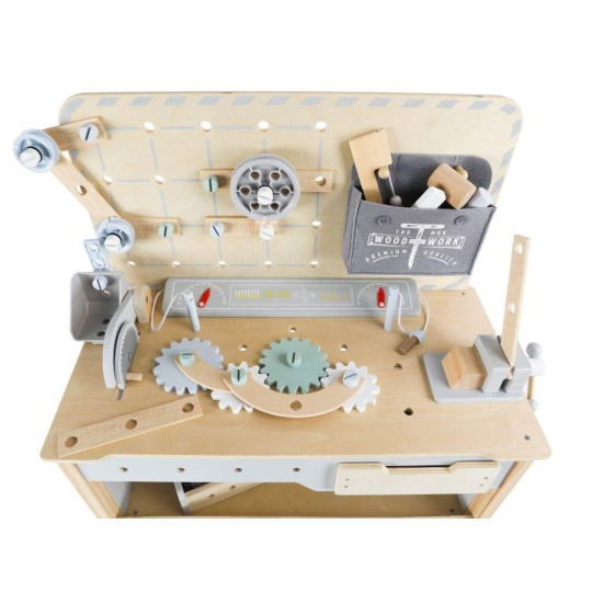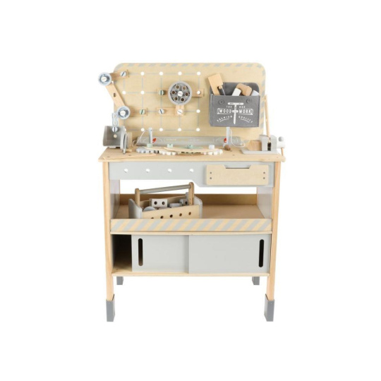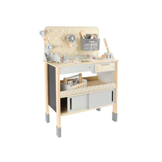 Dětský dřevěný ponk XXL se spoustou příslušenství, parádním jeřábem a opaskem na nářadí ZDARMA nadchne každého malého kutila. Dětský ponk v kombinaci šedé barvy s barvou přírodního dřeva, s jeřábem, nářadím, šrouby, destičkami a hlavně se spoustou vychytávek potrénuje jemnou motoriku, manuální zručnost, koordinaci očí a rukou, rozvíjí kreativitu, učí děti soustředit se a trpělivosti..