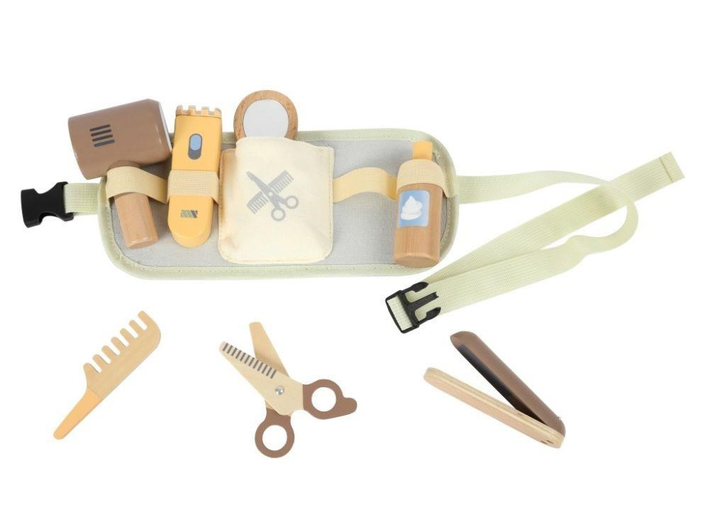 Dřevěná kadeřnická sada, v krásných a zároveň neutrálních barvách, uložená v praktickém opasku, promění každé dítě v profesionálního kadeřníka, holiče, který se s nadšením postará o dokonalý účes celé rodiny. Díky opasku bude vše snadno uklizené, přenosné a vždy po ruce. Děti si svůj oblíbený kadeřnický set mohou vzít s sebou na návštěvu, na víkend k babičce i na dovolenou. Kadeřnická sada zdokonaluje dětské dovednosti, manuální zručnost, rozvíjí fantazii, umožňuje dětem hrát role..