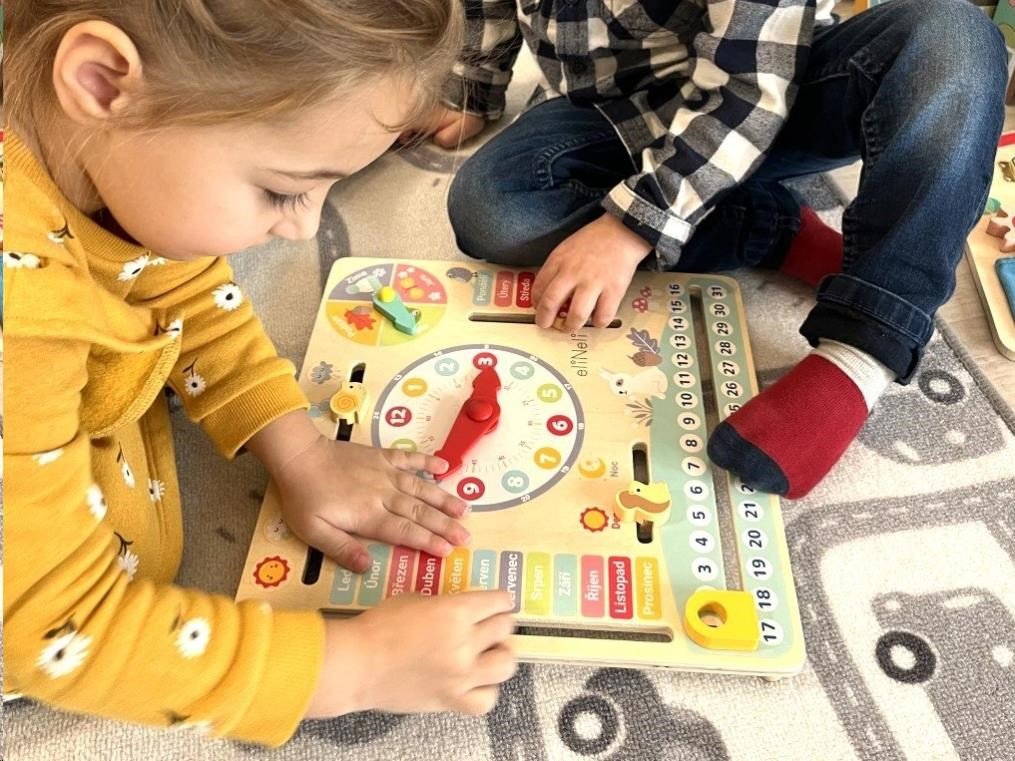 Dřevěný kalendář v češtině je krásnou vzdělávací hračkou i jedinečnou dekorací do pokojíčku holčiček i chlapců. Dětský kalendář v barevné kombinaci přírodního dřeva a krásných barev, s přírodními motivy a zvířátky, provede děti celým kalendářním rokem. Kalendář s lesními zvířátky pomůže dětem s orientací v čase. Pro děti je velice těžké pochopit a naučit se něco, co si nedokáží představit. S dětským kalendářem budou mít děti názorné ukázky, jak plyne den, jaké může být venku počasí, jak se střídají roční období, jak jdou jednotlivé dny a měsíce po sobě. Uprostřed kalendáře děti najdou velké barevné hodiny.