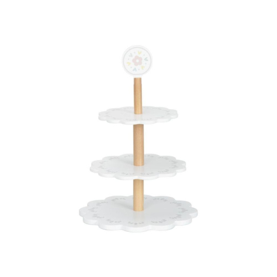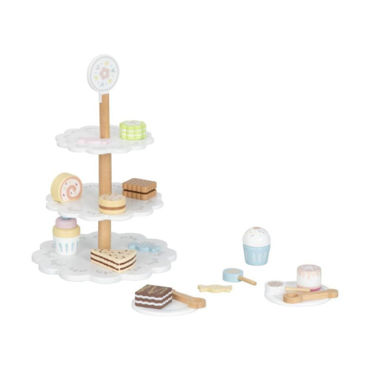 Dřevěný patrový stojan s lahodně vypadajícími dřevěnými zákusky a cukrovinkami je jako stvořený pro oslavy a čajové dýchánky uspořádané pro rodiče, kamarády i oblíbené plyšáky. Dřevěný stojan s bohatým příslušenstvím je skvělým doplňkem do dětské kuchyňky i obchůdku. Děti si mohou zahrát na cukráře i prodavače, rozvíjet svou fantazii a zdokonalovat dovednosti..