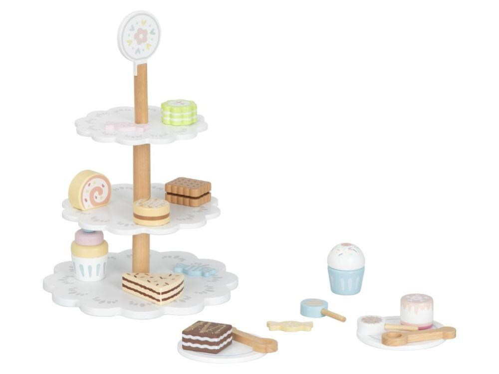 Dřevěný patrový stojan s lahodně vypadajícími dřevěnými zákusky a cukrovinkami je jako stvořený pro oslavy a čajové dýchánky uspořádané pro rodiče, kamarády i oblíbené plyšáky. Dřevěný stojan s bohatým příslušenstvím je skvělým doplňkem do dětské kuchyňky i obchůdku. Děti si mohou zahrát na cukráře i prodavače, rozvíjet svou fantazii a zdokonalovat dovednosti..