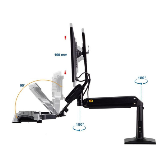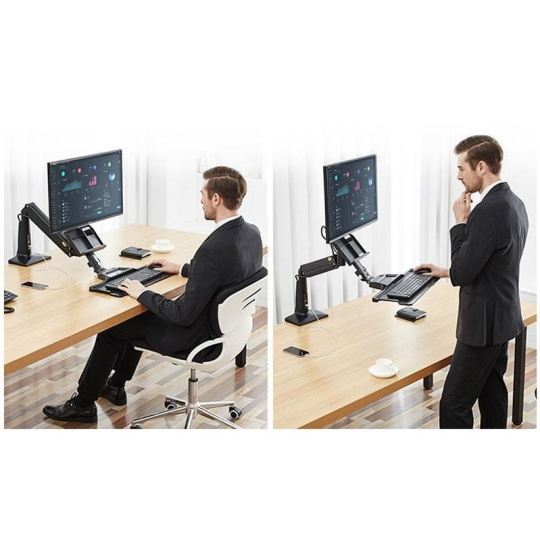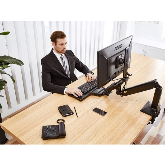 Stolní držák na monitor 17-30" a poličkou na klávesnici, výškové polohování +/-480mm, naklápění +12°/-15°, otáčení +/-180°, pivot, možnost vysunutí a zaklopení police, přihrádka, 2x USB 3.0 porty, práce v sedě i vestoje, VESA 75x75 a 100x100, nosnost 9kg.... více