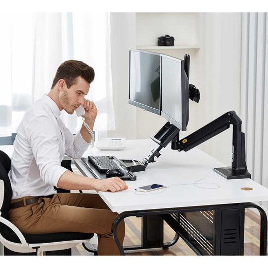 Stolní držák na 2 monitory a klávesnici NB FC24-2A-B Profesionální pracovní stanice pro dva monitory 17-27" s policí na klávesnici a myš, ergonomický držák pro rychlou změnu pro práci vsedě nebo vestoje, plná polohovatelnost, VESA 75x75 a 100x100, plynová pružina, nosnost 15kg Profesionální stolní držák na 2 monitory 17-27" s policí na klávesnici a myš, ergonomický pro práci ve stoje nebo vsedě se snadným a rychlým výškovým polohováním 480mm. Monitory lze na držáku posouvat do stran, naklápět, otočit na šířku nebo na výšku, mírně natáčet do stran, výškově polohovat. Extrémně snadné výškové polohování celého držáku díky plynové pružině, během okamžiku můžete změnit pozici vsedě na pozici vestoje a otočit držák do stran +/- 180°. Profesionální kvalita s důrazem na dizajn, 2x USB porty 3.0, systém pro vedení kabeláže, snadná instalace na stolové desky o průměru 10-95mm. Barevné provedení černé, záruka 3 roky. Pracovní stanice na 2 monitory 17-27" s policí na klávesnici a myš, ergonomický pro práci vsedě nebo vestoje NB FC24-2A Technické údaje: nosnost minimální 9kg / maximální 15 kg VESA standard 75x75 a 100x100 na monitory a displeje s úhlopříčkou 17-27" naklápění monitorů +16° / -10° nastavení výšky monitoruod police +/- 191 mm výškové polohování celého držáku +/- 480 mm maximální výška od pracovní desky 1011 mm otáčení do stran +/- 180° funkce PIVOT - otočení monitorů na šířku nebo na výšku úprava vzdálenosti police 0 ~ 60 mm rozměry police na klávesnici 560x200 mm organizátor pod obrazovkou o rozměrech 220x160 mm dva porty USB 3.0 systém vedení kabeláže ergonomický držák pro rychlé nastavení pro práci vsedě nebo vestoje uchycení na okraj stolu, stolové desky o síle 10-95mm profesionální kvalita a zpracovnání jednoduchá montáž a velmi snadné polohování barevné provedení černé záruka 3 roky Držák NB FC24-2A-B podporuje VESA standardy: VESA 75x75 VESA 100x100.
