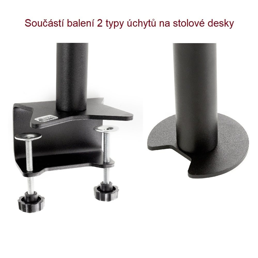 Profesionální stolní držák na 2 monitory EDBAK SV08 Profesionální stolní držák pro zavěšení 2 monitorů 15-30" vertikálně, otočný, sklopný, výškově nastavitelný, barva černá, VESA 75x75 a 100x100, nosnost 20kg Profesionální stolní držák pro nezávislé zavěšení monitorů nebo menších televizorů pod sebe. Držák umožňuje nezávislé nastavení každého monitoru - nastavení výšky, náklonu a natočení do stran. Dodáváme včetně 2 typů uchycení na stolovou desku (viz. obr. níže), barevné provedení černé. Držák je vyroben z kvalitní silnostěnné oceli a neobsahuje žádné plastové nosné prvky. Díky profesionální konstrukci a výborné kvalitě je vhodný do jakéhokoliv provozu, kanceláře nebo pracovny. Stolní držák do kanceláře pro zavěšení 2 monitorů pod sebe - EDBAK SV08 Technické údaje: celkové maximální zatížení 20kg maximální hmotnost každé obrazovky 10kg podpora VESA standardu 75x75 a 100x100 doporučujeme na monitory a obrazovky s úhlopříčkami 15" až 30" nezávislé výškové nastavení každé obrazovky nezávislé natočení do stran každé obrazovky nezávislé nastavení sklonu každé obrazovky robustní ocelová konstrukce bez nosných plastových částí funkce pivot - možnost přetočení obrazovky na výšku vhodný do jakéhokoliv provozu dodáváme včetně 2 typů stolového uchycení (viz. obr. níže) certifikát TUV GS barva černá záruka 10 let Stolní držák na 2 monitory nebo Tv Edbak SV08 Držáky na 2 monitory Edbak SV08 podporují VESA standardy: VESA 75x75 VESA 100x100.
