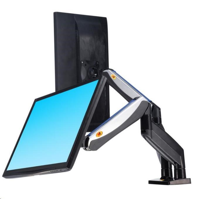 Nastavitelný držák pro dva monitory o hmotnosti od 2 kg do 8 kg, TOP design a kvalita Velmi kvalitní stolní držák pro zavěšení 2 monitorů na stolovou desku v kanceláři, pracovně nebo domácnosti. Monitory je možné nezávisle otáčet do stran, naklápět, posouvat. Možná je i úprava výšky od stolové desky, horizontální i vertikální otáčení obrazovky, korekce roviny. Pouze jednou nastavíte hmotnost Vaších monitoru na držáku a dále už nebute muset používat žádné nářadí. Velmi pěkný design, kvalitní bezpečná konstrukce, snadná manipulace. Polohovatelný stolní držák na dva monitory do kanceláře Technické údaje: celková nosnost 16kg zavěšení 2 monitorů s hmotnosti 2-8kg doporučujeme na monitory 19" až 30" náklon +55°/-8° natočení monitoru vpravo-vlevo o 180° otáčení ramena o 360° funkce PIVOT - otočení monitoru o 360° minimální výška monitoru od pracovní desky 230 mm (střed monitoru) maximální výška monitoru od pracovní desky 530 mm (střed monitoru) maximální tloušťka pracovní desky 90 mm nastavitelná vzdálenost do 625 mm Korekce roviny 2x USB port Systém pro skryté vedení kabeláže dva typy uchcení ke stolu - na okraj nebo skrz desku vestavěná pružina pro snadné nastavení výšky vysoká kvalita s důrazem na detail moderní design vyrobeno z hliníku a slitiny oceli snadná a rychlá instalace barevné provedení černé+chrom záruka 5 let Stolní držák F185A podporuje VESA standard: 75x75 100x100.