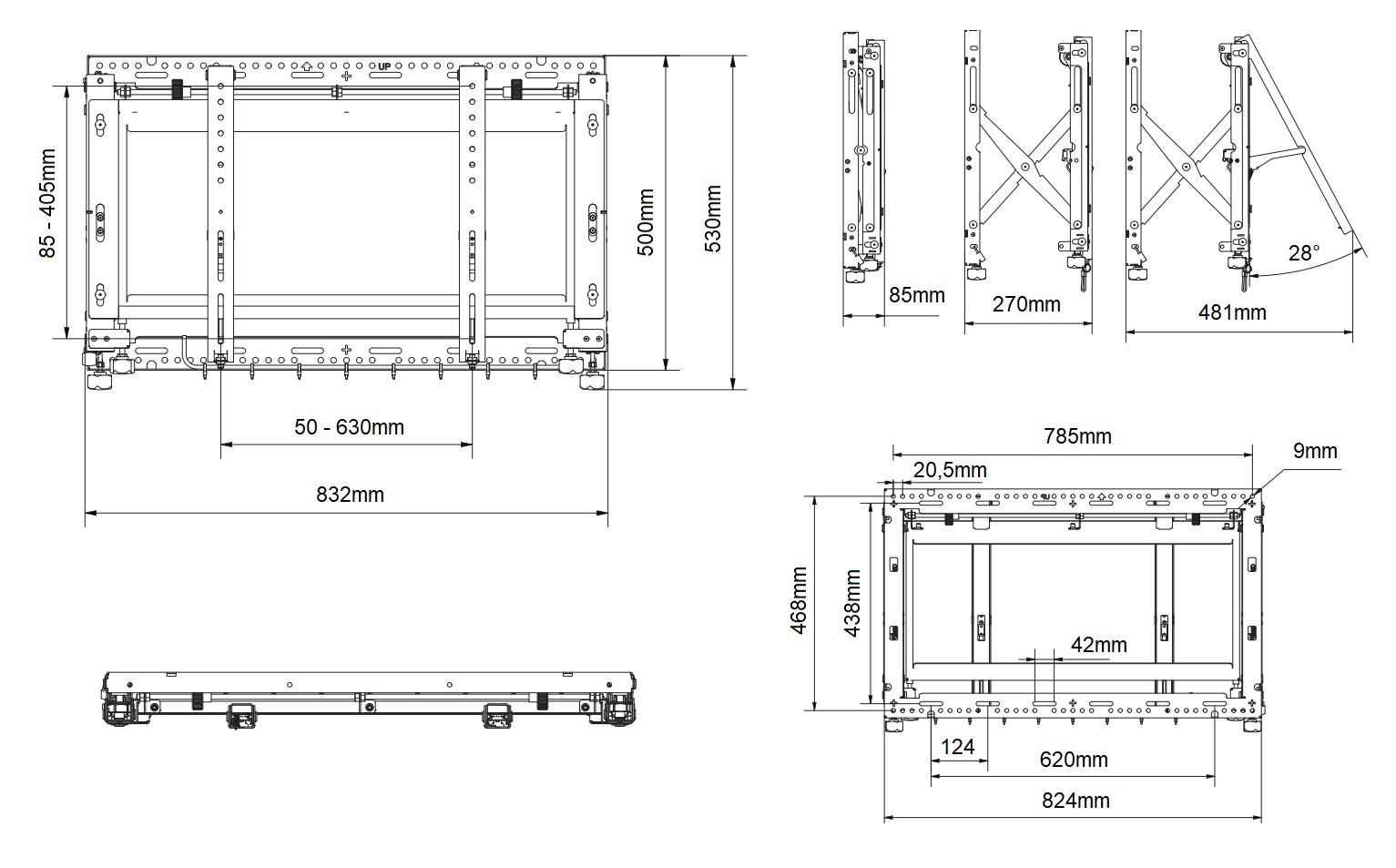 Technické údaje: maximální zatížení 60kg na televizory a monitory s úhlopříčkou 40" až 65" VESA standart 100x100 až 600x400 nezávislé zavěšení každé obrazovky 8-polohové nastavení každé z obrazovek bez použití nářadí zasouvací mechanismus pro pohodlný přístup k obrazovkám možnost uzamčení zatahovacího mechanismu otevřená konstrukce držáku umožní snadný přístup k zapojení obrazovek profesionální konstrukce držáku eliminuje nutnost výpočtů pro realizaci montáže pružinový systém pro nastavení požadované tuhosti - v případě zavěšení obrazovek různých hmotností nejvyšší kvalita, špičkový nezávislý systém zavěšení barva černá záruka 5 let Držák pro sestavu videostěny EDBAK VWPOP85-L podporuje VESA standardy: VESA 100x100 VESA 200x100 a 100x200 VESA 200x200 VESA 300x200 a 200x300 VESA 300x300 VESA 400x200 a 200x400 VESA 400x300 a 300x400 VESA 400x400 VESA 600x400.