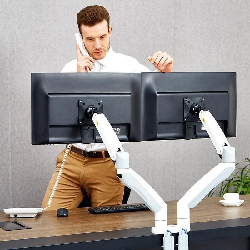 Dvoumonitorový stolní držák NB F195AW Profesionální stolní držák na 2 monitory 21-32", 3D nezávislé nastavení polohy, bílé provedení, profesionální kvalita Špičkový stolní držák pro zavěšení 2 monitorů a jejich nezávislé nastavení polohy: otáčení do stran, nastavení výšky, nastavení vzdálenosti od stolního úchytu, náklon, rotace obrazovky, korekce roviny. Různé nastavení polohy monitorů - vedle sebe na šířku, vedle sebe na výšku, pod sebou na šířku, nebo jeden monitor na šířku a druhý na výšku. Hmotnost každého monitoru musí být v rozmezí 3-9kg. Balení obsahuje 2 typy úchytů na stolovou desku, instalační materiál a návod. Barevné provedení bílé. Záruka 3 roky. Bílý držák na dva monitory, polohovatelný, profesionální kvality, záruka 3 roky - Mounts F195AWProfesionální bílý držák na 2 monitory, různé polohování monitorů, plně nastavitelný držák, TOP kvalita - Mounts F195AW Bílý držák na dva monitory, do kanceláře, pracovny, nemocnice, ordinace. Top kvalita, snadné polohování. Držák 2 monitorů Mounts F195AW Technické údaje: celková nosnost 18kg hmotnost každého monitoru musí být v rozmezí 3 ÷ 9 kg podpora VESA standardu 75x75 a 100x100 v případě potřeby za příplatek možnost rozšíření VESA na 200x100 nebo 200x200 doporučená úhlopříčka monitorů 21" až 32" nezávislé nastavení výšky: min. 220mm, max. 565mm nezávislé otáčení monitoru do stran +/- 180° nezávislé naklonění monitoru +53° až -8° nezávislá rotace monitoru - otočení monitoru na šířku nebo na výšku, korekce roviny nezávislé nastavení vzdálenosti od stolního úchytu: 0mm až 700mm uchycení na stolové desky o průměru 10mm až 90mm balení obsahuje 2 typy úchytů na stolové desky (na okraj, do prostoru) 2x USB port vynikající kvalita, krásný design snadné nastavení polohy monitorů spolehlivost, bezpečnost barevné provedení bílé, stříbrné nebo černé záruka 3 roky Mounts F195AW - bílý stolní držák pro nezávislé zavěšení a polohování dvou monitorů Dvoumonitorový stolní držák NB F195AW podporuje VESA standardy: VESA 75x75 VESA 100x100 za příplatek rozšíření na VESA 200x100 za příplatek rozšíření na VESA 200x200 Bílý držák na dva monitory Mounts F195AW Velmi pěkný bílý držák na dva monitory, nezávislé polohování každého monitoru, snadná nastavitelnost, profesionální kvalita a zpracování. Ideální držák do moderních kanceláří, ordinací, nemocnic nebo pracoven..