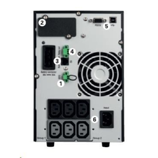 | Komunikace | USB port (kompatibilní s HID) Sériový port (RS232) Mini-svorkovnice pro vzdálené vypnutí napájení (RPO) Mini svorkovnice pro výstupní relé Bezpotenciálové kontakty (2 výstupy, 1 vstup, optočlen, DB9) |