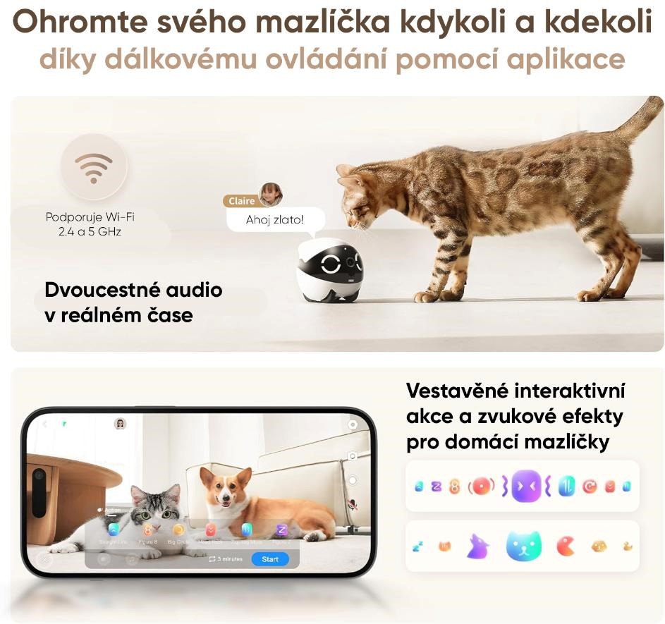 - Dálkové ovládání přes aplikaci – ovládejte robota odkudkoli a sledujte, co váš mazlíček právě dělá.