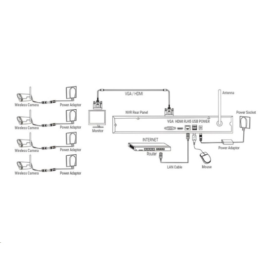 | Obsah balení | NVR jednotka s 8 kanály, SATA připojením pro až 8TB disk 4x Bezdrátová Bullet IP66 kamera s nočním přísvitem 4x Anténa pro bezdrátovou kameru 2,4G 5db 1x napájecí adaptér DC 12V 2A pro NVR 4x napájecí adaptér pro kamery 4x sada pro upevnění kamery 4x bajonetová těsnící krytka pro RJ45 konektor 1x Anténa pro NVR jednotku 1xUSB myš 1xSATA kabel pro připojení HDD 1x Uživatelský manuál |