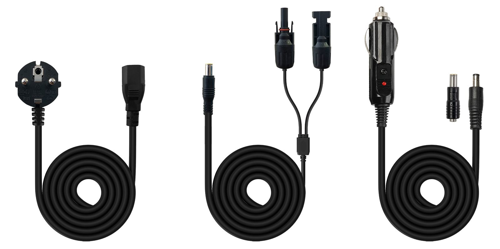 - Nabíjecí kabely v balení: 1× do zásuvky 230 V, 1× do auta a 1× pro solární panel