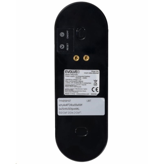 | Obsah balení | EVOLVEO Ringo DB2, chytrý videozvonek Zvonek do zásuvky Uživatelský manuál Plochá montážní konzole Úhlová montážní konzole 3M samolepící montážní nálepka Nabíjecí kabel USB Malý inbusový klíč Bezpečnostní šroub 2x montážní šroub + hmoždinky 2x montážní šrouby pro úhlovou konzoli 2x připojovací vodiče pro pevnou kabeláž 2x šrouby pro připojení vodičů |