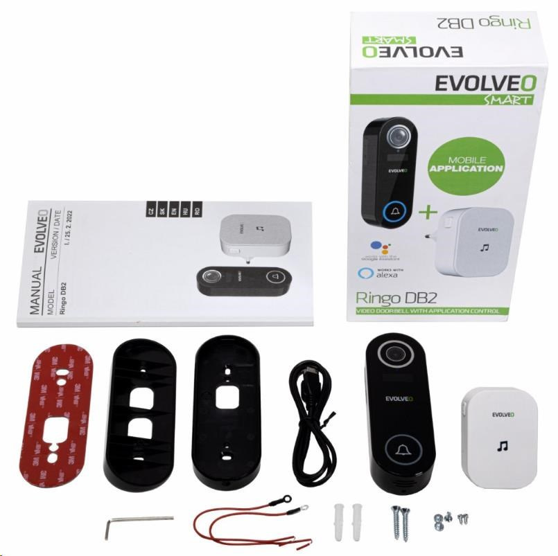 | Obsah balení | EVOLVEO Ringo DB2, chytrý videozvonek Zvonek do zásuvky Uživatelský manuál Plochá montážní konzole Úhlová montážní konzole 3M samolepící montážní nálepka Nabíjecí kabel USB Malý inbusový klíč Bezpečnostní šroub 2x montážní šroub + hmoždinky 2x montážní šrouby pro úhlovou konzoli 2x připojovací vodiče pro pevnou kabeláž 2x šrouby pro připojení vodičů |