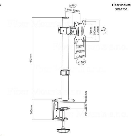 Fiber Mounts SDM751 - levný stolní držák na monitor Kvalitní nastavitelný stolní držák na monitor 13-32", otočný, sklopný, výškově stavitelný Univerzální stolový držák pro uchycení monitoru s úhlopříčkou 13-32". Spolehlivé a bezpečné upnutí, 2 možnosti ukotvení na jakoukoliv vodorovnou plochu o síle 10-88mm. Polohování obrazovky otáčením do stran, náklonem a výškovou regulací. Velmi pevná a bezpečná konstrukce z oceli. Nosnost 8kg, podpora VESA standardu 75x75 a 100x100. Díky své kvalitě a velmi příznivé ceně se tento držák stal velmi oblíbeným a vyhledávaným pro instalaci v domácnostech a ve školních učebnách, velmi často se s ním setkáte i ve firmách, kancelářích a prodejnách. Levný držák na monitor, televizor, tablet nebo EET pokladnu s úhlopříčkou 13-32 palců, VESA standard, otočný, sklopný, výškové nastavení, 2 typy ukotvení - Fiber Mounts SDM751 / drzakyastolky.cz Technické údaje: maximální zatížení 8kg podporuje VESA standardy 75x75 a 100x100 možnost rozšíření na VESA 200x100 nebo 200x200 doporučená úhlopříčka obrazovky 13 až 32" vhodný na monitory, televizory, tablety i EET pokladny otáčení do stran +/- 90° náklon +/- 45° celková výška 443mm výškové polohování obrazovky upnutí na vodorovnou plochu o síle 10-88mm součástí balení 2 typy upnutí bezpečné a spolehlivé zavěšení obrazovky fixace kabeláže materiál ocel barva černá záruka 2 roky Držák podporuje VESA standardy: VESA 75x75 VESA 100x100.