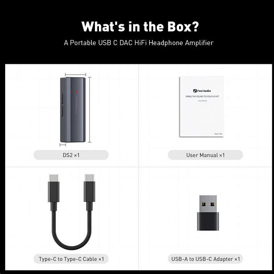 Kompaktní USB-C DAC/sluchátkový zesilovač v kovovém těle, dvojice čipů Cirrus Logic CS43131, podpora PCM 32bit/384 kHz a DSD256. Kompatibilní s iOS / Android / Windows / macOS. Výstupy: 3,5 mm a symetrický 4,4 mm s výkonem 128 mW / 170 mW @ 32 ?, SNR ? 130 dB, THD < 0,0002 % a šumem < 1µV. Vhodný pro sluchátka 16–300 ?. Hmotnost ~90 g. Součást balení: USB-C kabel, USB-C/A adaptér, uživatelský manuál..