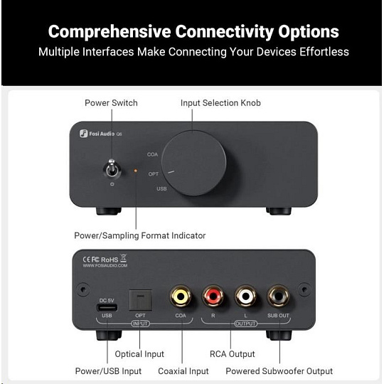 Kompaktní a robustní stolní DAC v hliníkovém těle, čip AKM AK4493S, procesor XMOS XU316 s operačním zesilovačem OPA1612. Formáty PCM 32bit/768 kHz a DSD512 (Windows, macOS i Linux). Vstupy: USB-C, optický a koaxiální. Výstupy: RCA, Sub. THD < 0,00012 %, SNR ? 121 dB, dynamický rozsah 121 dB. Napájení 5V/2A. Součást balení: USB-C kabel, napájecí kabel / adaptér, uživatelský manuál..