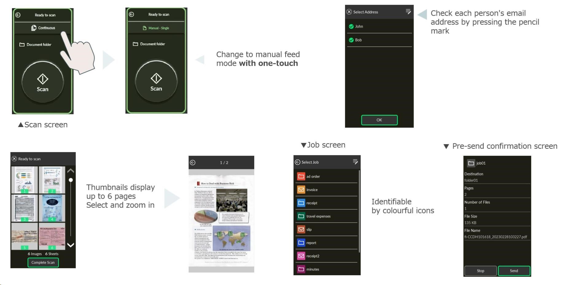 | Output Filetypes | PDF, Searchable PDF, PDF/A, TIFF, Multi-Page TIFF, Bitmap, JPEG, JPEG2000, PNG, Word, Excel, PowerPoint When using DirectScan: JPEG, PDF, SinglePage PDF only | |