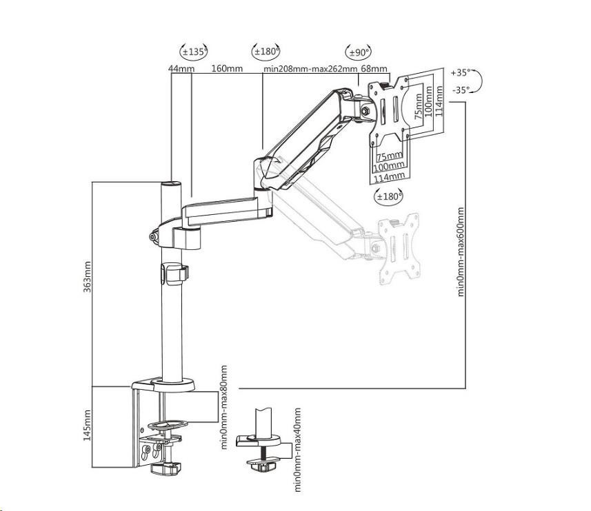 Full motion držák monitoru Fiber Mounts M7C75 Plně nastavitelný stolní držák na monitory 13-32", VESA 75x75 a 100x100, nosnost 8kg Nabízíme velmi pěkný designový monitorový držák vynikající konstrukce, který podporuje plnou nastavitelnost polohy obrazovky: dvojí nastavení výšky (na nosníku, ramenem s plynovým pístem), nastavení vzdálenosti monitoru od nosníku, otáčení na obě strany bez omezení, velký náklon jak nahoru tak dole. Flexibilitu zvyšují i dodávané 2 typy uchycení na stolovou desku - na okraj stolu nebo do prostoru stolu přes průchodku. Držák monitoru Fiber Mounts M7C75 uživatele uchvátí jak opravdu krásným vzhledem, tak vynikajícím provedením a skvělou funkčností. Monitorový držák flexibilní polohovatelný Fiber Mounts M7C75 vás mile překvapí svou vynikající kvalitou, pěkným vzhledem a vynikající nastavitelností Technické údaje: nosnost 8kg podporuje VESA standardy 75x75 a 100x100 nastavení výšky po celé délce nosníku 363mm nastavení výšky ramenem s pístem 150mm celkové nastavení výšky 0-600mm otáčení do stran +/- 360° náklon +/- 35° nastavení vzdálenosti od nosníku 44-534mm funkce PIVOT - otočení monitoru na šířku nebo na výšku korekce roviny monitoru systém pro vedení kabeláže 2 úchyty na stolovou desku: na okraj stolu nebo do prostoru stolové desky přes průchodku full motion nastavení polohy vynikající konstrukce TOP kvality krásný moderní design velmi odolná a stabilní konstrukce materiál ocel a hliník barevné provedení černé záruka 3 roky.
