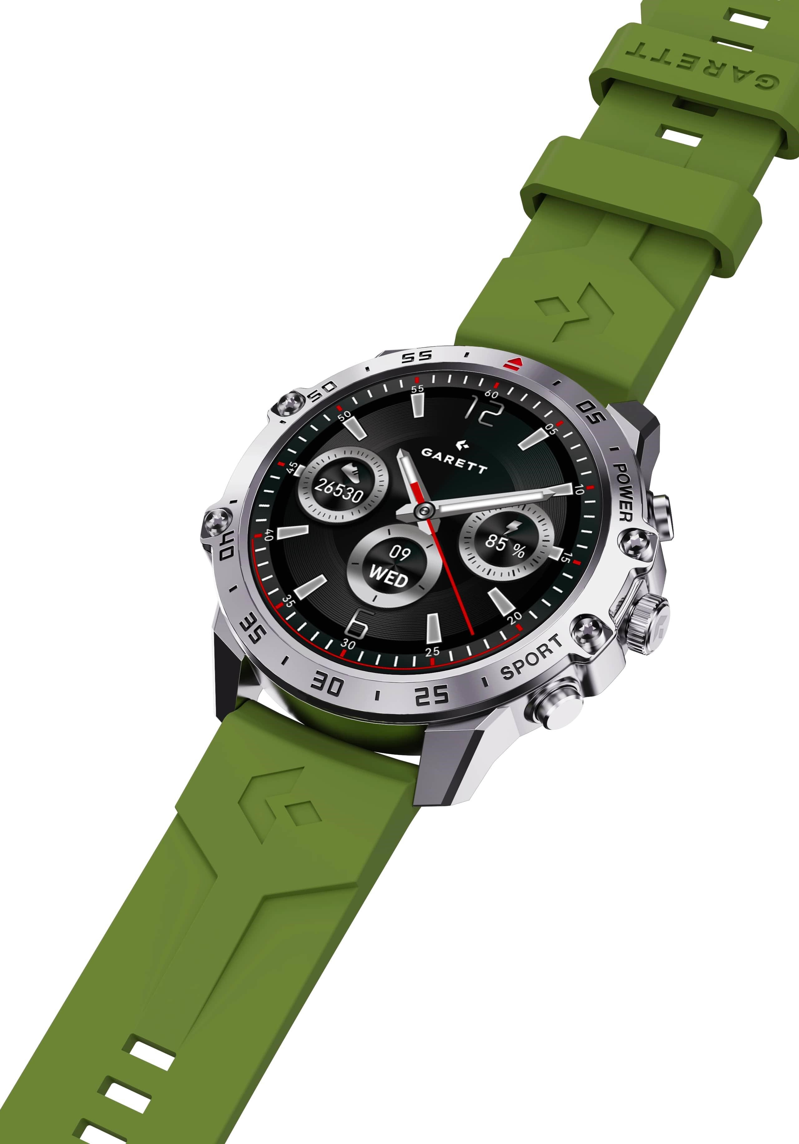 - Sada obsahuje: GARETT smartwatch, přídavný silikonový pásek, nabíjecí kabel, QSG návod