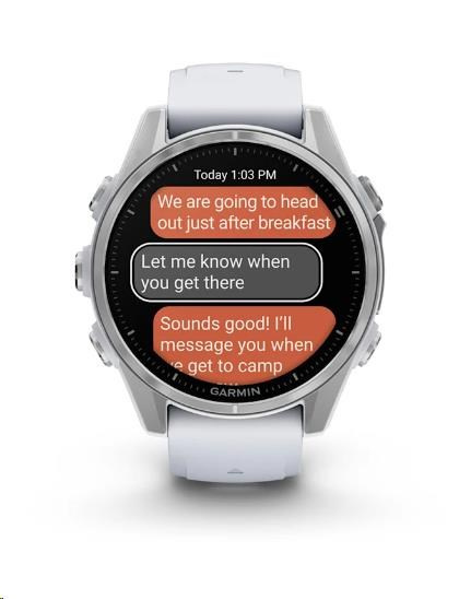 Na hodinkách můžete přijímat e-maily, textové zprávy a upozornění na spárovaném telefonu Android nebo Apple. Hodinky rovněž podporují platby Garmin Pay, abyste se při svých dobrodružstvích mohli vydat kamkoliv a nestarat se o to, že jste něco zapomněli doma. S hodinkami Garmin fénix 8 máte totiž vždy všechno důležité po ruce - na svém zápěstí.