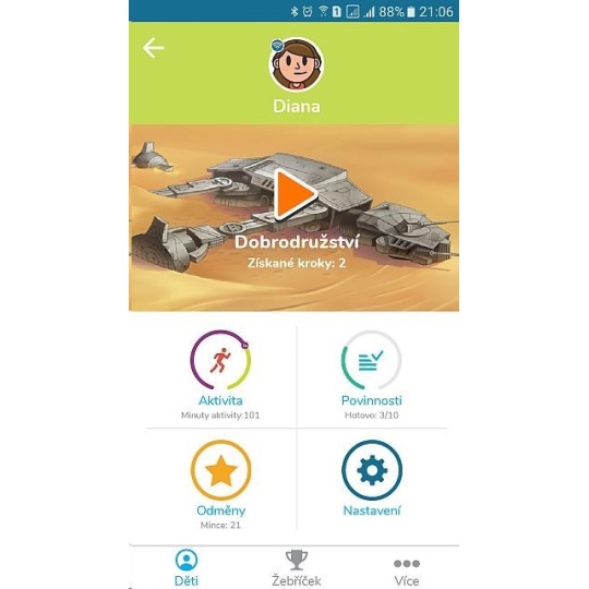 Fitness náramek pro děti s motivy kreslených postaviček od Disney a komiksových akčních hrdinů. * motivuje děti k pohybu, plnění úkolů a soutěžení * odměny za plnění domácích povinností * barevný displej, skvěle viditelný a čitelný i na přímém slunci * odolné a pohodlné řemínky ve dvou velikostech * aplikace pro mobilní telefony zdarma * počítá nachozené kroky za den a minuty strávené intenzivním pohybem * upozorňuje na neaktivitu a vybízí k pohybu (např. při dlouhodobém sezení) * upozornění (alarmy) na naplánovaný čas plnění úkolů (zvukem, obrázkem a textem) * bez nutnosti nabíjení, baterie s dobou provozu více jak 1 rok * vodotěsné i pro plavání.