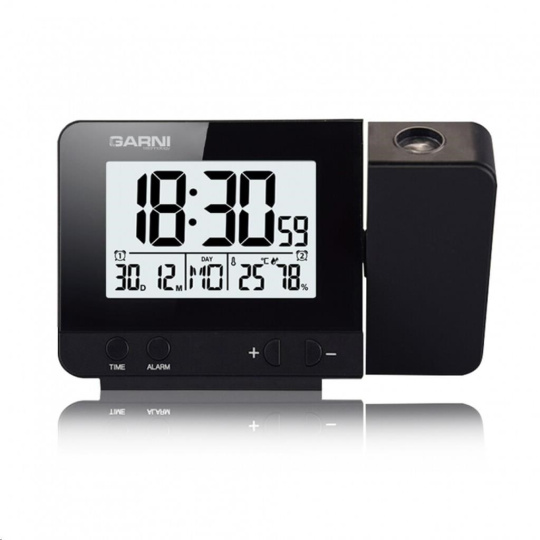 Digitální budík s projekcí času a vnitřní teploty s LCD displejem, časem řízeným rádiovým signálem DCF-77 a měřením vnitřní teploty a relativní vlhkosti LCD displej o rozměrech 63 x 42 mm s možností stálého osvětlení při napájení síťovým adaptérem, nebo krátkodobým osvětlením na 8 s při napájení bateriemi 3 stupně jasu osvětlení displeje, možnost vypnutí osvětlení displeje (při napájení síťovým adaptérem) velikost číslic na displeji – čas 25 mm, datum, zkratka názvu dne, vnitřní teplota a rel. vlhkost 8,5 mm čas a datum řízené signálem DCF-77 s možností manuálního nastavení ikona příjmu signálu DCF-77 zkratka názvu dne 12ti, nebo 24 hodinový formát zobrazení času možnost nastavení časového pásma od -12 do +12 hodin budík s 2 budícími časy s funkcí opakovaného buzení (Snooze) po 5 minutách budící signál - 10 sekund 1 pípnutí za sekundu, 10 sekund 2 pípnutí za sekundu, 10 sekund 4 pípnutí za sekundu a poté stálé pípání projekce času a vnitřní teploty s možností otočení obrazu o 180°, možnost sklopení tubusu projektoru o 90° dopředu a dozadu barva projekce červená stálá projekce při napájení síťovým adaptérem s možností vypnutí zobrazení hodnot vnitřní teploty a relativní vlhkosti zobrazení teploty ve °C, nebo °F USB port pro nabíjení mobilních zařízení (pouze při napájení hlavní jednotky síťovým adaptérem), maximální nabíjecí proud 1 000 mA napájení síťovým adaptérem, nebo bateriemi možnost postavení barva černá Obsah balení: 1 x digitální budík GARNI 140 1 x síťový adaptér český, slovenský, německý, anglický, italský, polský a maďarský návod.