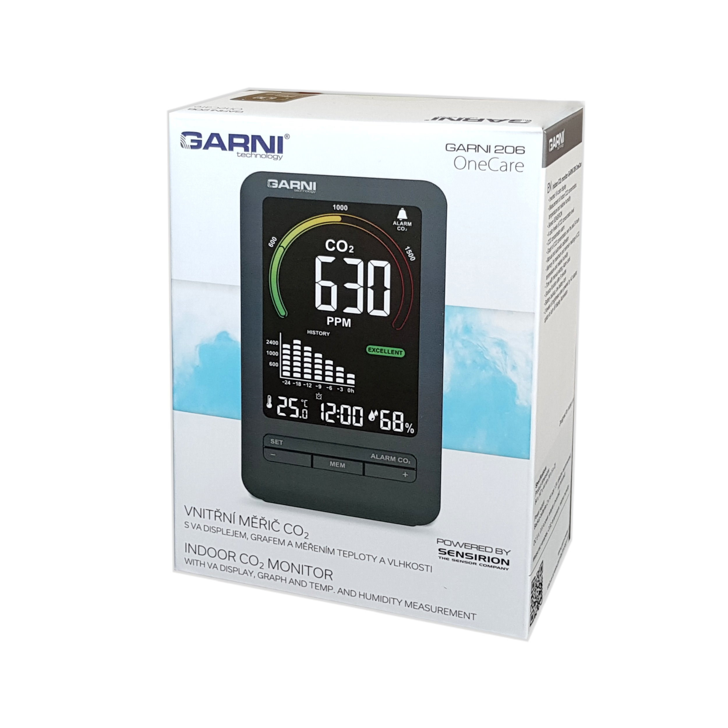 Měřič CO2 (kysličníku uhličitého) GARNI 206 OneCare je určen pro vnitřní použití. Měří a zobrazuje na svém barevném inverzním VA displeji hodnoty CO2 ve vzduchu a také teplotu a relativní vlhkost. Graf zobrazuje vývoj naměřené hodnoty CO2 za uplynulých 24 hodin. Pro měření CO2, teploty a relativní vlhkosti je použito fotoakustické čidlo SENSIRION řady SCD4x