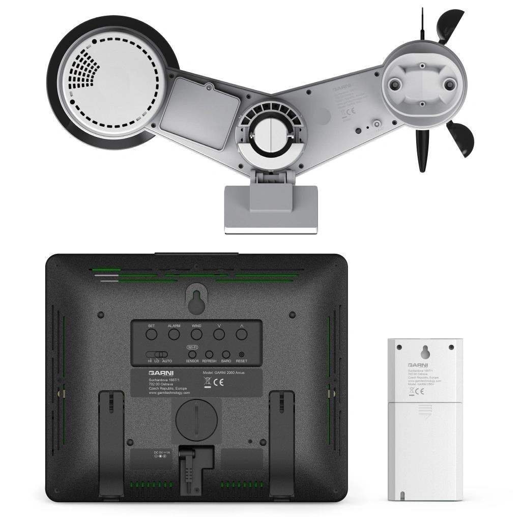 Meteorologická stanice s Wi-Fi, 24hodinovou / 7denní předpovědí a profesionálním integrovaným bezdrátovým čidlem 7-v-1 se solárním panelem a vestavěným kapacitorem, model GARNI 2060 Arcus, shromažďuje přesné a podrobné údaje o počasí, které jsou pak v reálném čase odesílány pomocí vestavěného Wi-Fi modulu a místní sítě Wi-Fi na meteorologické servery a aplikace, jako jsou ProWeatherLive, Weather Underground, Weathercloud, Počasí Meteo nebo vlastní server uživatele (doporučeno pouze pro zkušené uživatele). Ty umožňují automatizované nahrávání dat meteorologické stanice a volný přístup ke všem datům odkudkoli s přístupem na internet, přes webový prohlížeč nebo mobilní aplikaci. Zároveň ProWeatherLive (PWL) server posílá 24hodinovou / 7denní předpověď počasí do hlavní jednotky. Výrobek nabízí solidní výkon všem profesionálním pozorovatelům a nadšencům díky široké škále nastavení a čidel. Meteorologická stanice vám poskytne lokální předpověď, maximální a minimální hodnoty a celkové hodnoty všech meteorologických proměnných, to vše bez nutnosti použití stolního počítače.