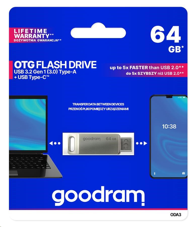 Type-C™ is becoming the most popular USB type used to transfer data between all electronic devices. The growing popularity of this solution is supported by the fact that manufacturers of next gen laptops, smartphones, PCs and other devices are increasingly equipping their products with an additional “C” next to the standard type A connector or choose only Type-C™. GOODRAM OTG ODA is an excellent solution that will work both with an old and new electronic devices generation laptops, smartphones and PCs. The ODA Flash drive is equipped with two fast USB 3.2 connectors: one standard type A and the Type-C™, which means that data transfer between devices of different generations has never been so easy and fast.