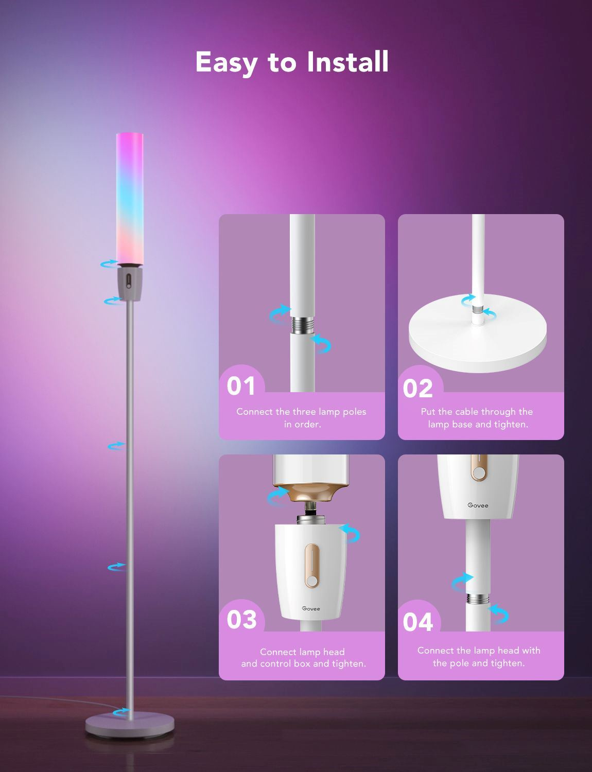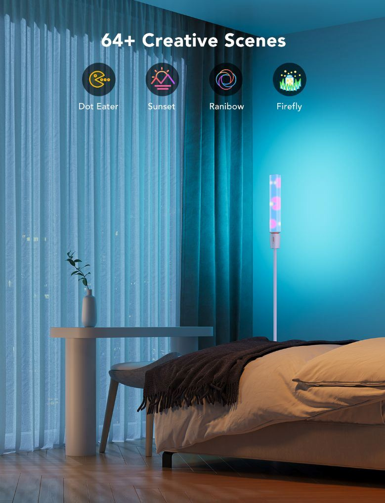 Govee Floor Lamp nabízí miliony barev a 64 přednastavených scénových režimů v aplikaci Govee Home. Prozkoumejte DIY režim a vytvořte si paletu přímo pro vás a váš interiér. Díky aplikaci můžete scény automatizovat a nastavit i časový rozvrh.