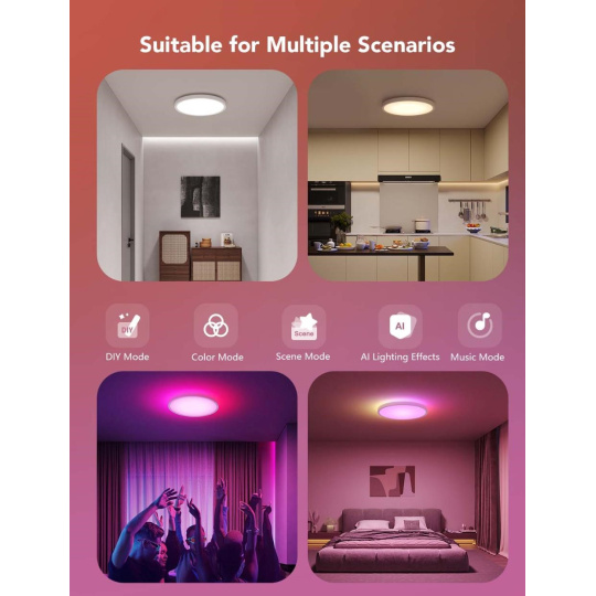 Proměňte svůj prostor pomocí dynamického vícebarevného osvětlení. Chytré stropní svítidlo Govee nabízí živé a přizpůsobitelné osvětlení, které se snadno sladí s vaší náladou i stylem. Díky technologii RGBIC+WW můžete zobrazovat 16 mil. barev a odstíny bílé současně a pohodlně ovládat celé světlo prostřednictvím intuitivní mobilní aplikace. Ať už jde o atmosféru, zábavu nebo každodenní osvětlení, užijte si naprostou volnost v režimu DIY a efekty, které oživí váš domov.