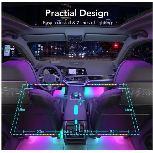Úsporné interiérové chytré LED pásky Govee Smart RGBIC do auta s životností až 50.000 hodin vylepší interiér vašeho automobilu a poskytnou zážitek, který se naskytuje u luxusních vozů. Můžete je použít prakticky všude, kde je zapalovaní. Zobrazuje až 16 milionů barev, jejichž intenzitu lze nastavit od 1-100%. Díky technologii RGBIC si můžete rozdělit pásek na samostatné segmenty, pro které si můžete pak volit rozdílné barvy. Vyberte si ze 30 režimů osvětlení a při poslouchaní oblíbené hudby se budou světla synchronizovat. Nebo si prostě nastavte svoje vlastní barevné kombinace v režimu DIY. Příkazy můžete zadat přes aplikaci Govee Home na chytrém telefonu nebo tabletu nebo přímo na Control boxu. Instalace je jednoduchá a je rozdělená na přední a zadní část automobilu.