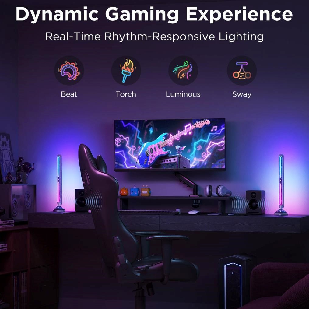 Panely nabízejí více než 60 unikátních světelných scén, které vám umožní přizpůsobit osvětlení přesně podle vaší nálady a stylu. Speciální vizuální efekty dokážou vytvořit dynamickou a poutavou atmosféru, a to nejen při hraní her, ale i sledování filmů nebo poslechu hudby. Díky funkci synchronizace s hudbou světla reagují v reálném čase na rytmus a zvuk, což přináší živý a interaktivní zážitek, který oživí každou místnost.