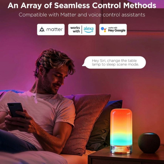 Govee LED Table Lamp 2, které vám zajistí maximální pohodlí a flexibilitu. Můžete ji ovládat dotykem přímo na těle lampy, jednoduše měnit barvy a jas podle potřeby. Pro ještě větší komfort je lampa kompatibilní s hlasovými asistenty, jako je Amazon Alexa a Google Assistant, takže můžete osvětlení upravovat pouhými hlasovými příkazy. Navíc podpora Matter protokolu zajišťuje bezproblémovou integraci s dalšími chytrými zařízeními ve vaší domácnosti, čímž nabízí snadné a jednotné ovládání celého vašeho smart home ekosystému.