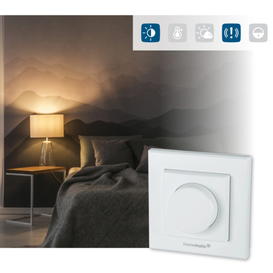 Nástěnné otočné tlačítko (HmIP-WRCR) nabízí možnosti flexibilní instalace a širokou modularitu využití v klasickém provedení, které zvládne několik úkolů současně.