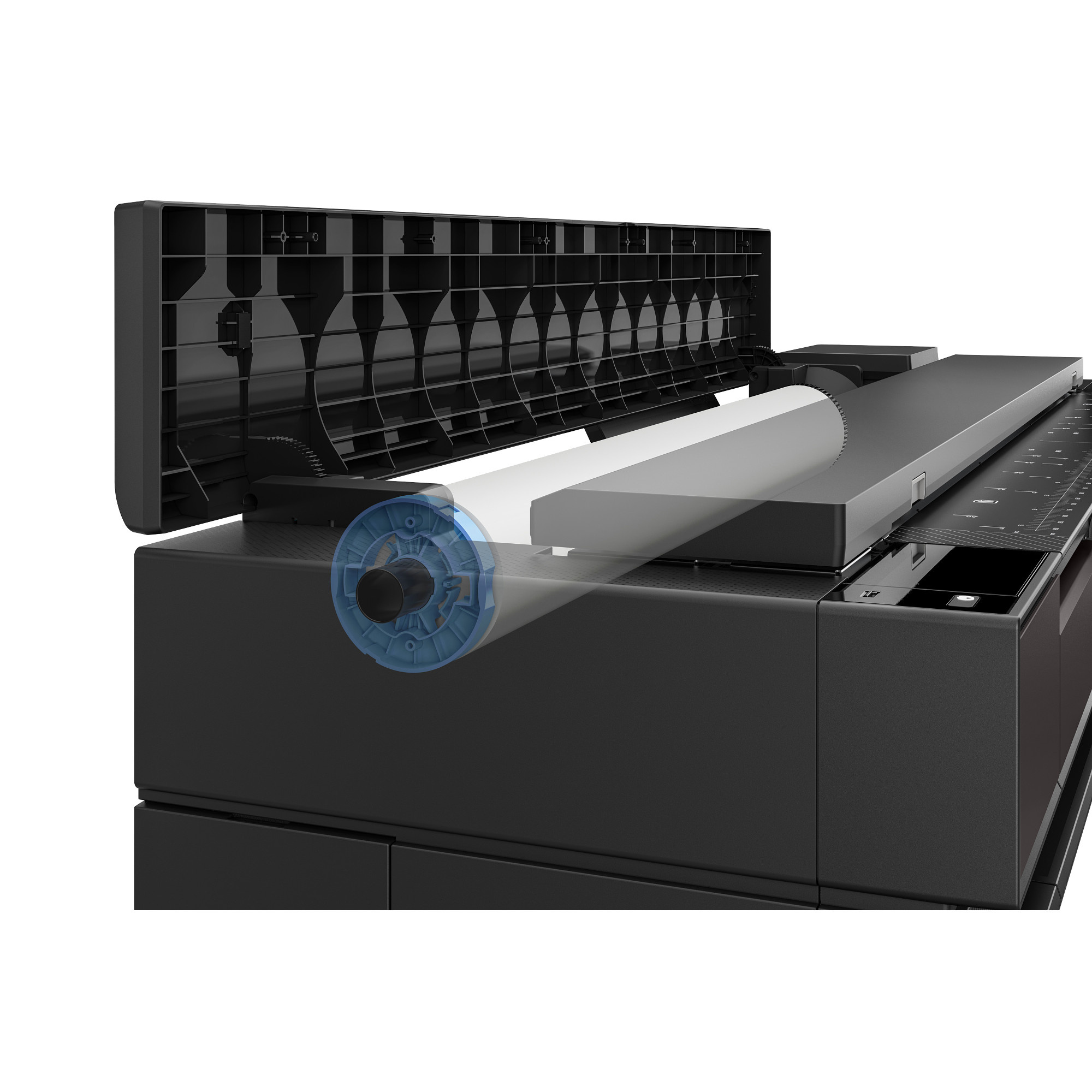 | Zpracování hotového výstupu | Podávání listů, podávání z role, vstupní zásobník (kapacita 50 listů), koš na média, automatická vodorovná řezačka |