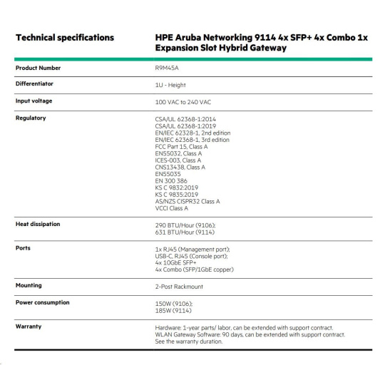 HPE Aruba Networking 9114 4x SFP+ 4x Combo 1x Expansion Slot Hybrid Gateway R9M45AR RENEW.