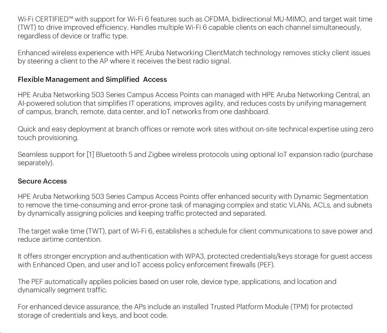 Flexible Operation and Management Our unified APs can operate as standalone access points or with a gateway for greater scalability, security, and manageability. APs can be deployed using zero touch provisioning - without on-site technical expertise - for ease of implementation in branch offices and for remote work. Aruba APs can be managed using cloud-based or on-premises solutions for any campus, branch, or remote work environment. As the management and orchestration console for Aruba ESP (Edge Services Platform), Aruba Central provides a single pane of glass for overseeing every aspect of wired and wireless LANs, WANs, and VPNs. AI-powered analytics, end-to-end orchestration and automation, and advanced security features are built natively into the solution. The 503 Series APs can also be deployed using HPE Greenlake for Aruba for flexible consumption and financing options.
