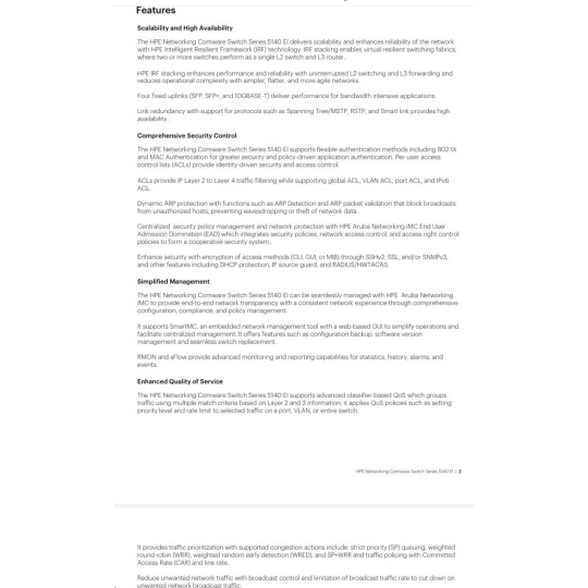 The HPE Networking Comware Switch Series 5140 EI comprises Gigabit Ethernet switches that support static, OSPF and RIP Layer 3 routing, convenient fixed 10GbE uplink ports, PoE+, ACLs, IPv6 and delivers energy savings with Energy Efficient Ethernet. Unique Intelligent Resilient Fabric (IRF) technology creates a virtual fabric by managing several switches as one logical device, which increases network resilience, performance, and availability, while reducing operational complexity. These switches provide Gigabit Ethernet access and can be used at the edge of a network or to connect server clusters in small data centers. High availability, simplified management, and comprehensive security control policies are among the key features that distinguish this series.