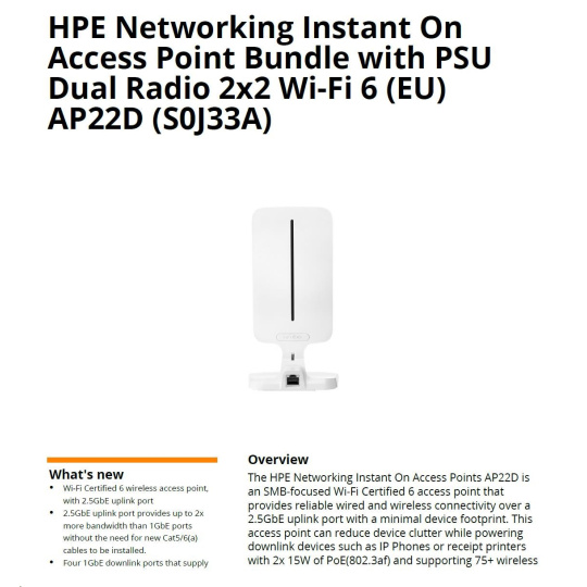 HPE Networking Instant On Access Point AP22D Bundle with PSU Dual Radio 2x2 Wi-Fi 6 (EU) AP22D.
